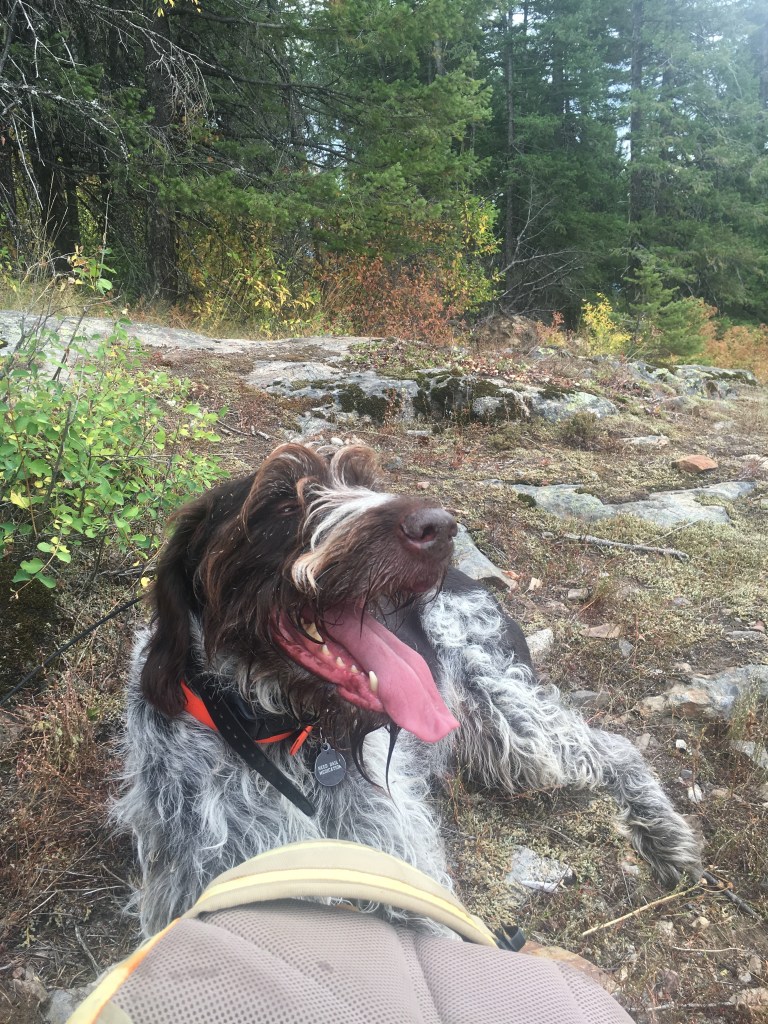 Proper hydration is one of the most common mistakes upland backpack hunters make when first getting into long adventures. Planning a route can help in these regards to make sure you are going to pass by known water sources. However, sometimes, you’re not sure if the stream will be a year-round source or if the spring is still active in the fall. Before leaving the truck, put out water in a bowl for your dog and relax until it drinks some. You can put a little kibble or honey in the water to encourage the dog to drink as well. Take extra water for your dog in addition to you, plan for both of you to have adequate water consumption. The amount of water to bring will depend on the weather conditions and distance from known water sources. You’ll want to at least plan your camp around known water sources, and, on hot early season days hunt around known water sources such as a stream or known springs. Then carry a liter or two plus for your dog. A small collapsible bowl is also a good idea to prevent waste from pouring water into a dog’s mouth. For several years we have used a water bladder and hose and sprayed the water into the dog’s mouth. This seems to work well on day hunts, but the drawbacks are you can’t easily monitor the water consumption and there is a lot of waste. As such, carrying in a water bottle is our go to method these days. Monitor the dog for signs of dehydration such as a swollen tongue or in the worst-case loss of balance. Stop and take breaks in the shade at a frequency depending on the temperature of the day. For warm days, this is every 20 minutes or so. For cool days breaks are often not needed but just some hydration.